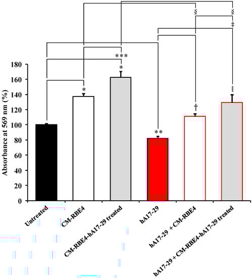 Both CMs produced a significant increase in absorbance at 569 nm on the MTT assay (p < 0.001 compared to control cells), with CM-RBE4-hA17–29 having the maximal effect (~+60%) and being significantly higher than that induced by CM-RBE4 (p < 0.01). This result suggests a metabolic rate and/or proliferation rate higher than control, induced by factors released in the medium by endothelial cells. Therefore, we assessed whether both CMs were capable to protect SH-SY5Y cells from the toxic effects produced by hA17–29. As shown in Figure 4, we found that SH-SY5Y cells challenged with 20 µM hA17–29 had decreased absorbance at 569 nm on the MTT assay by 21% (p < 0.01 compared to controls). Under these conditions, CM-RBE4 completely prevented hA17–29 toxicity (p < 0.01 compared to cells treated with hA17–29 only), with a slight increase in absorbance at 569 nm when compared to untreated (control) cells (~+10%). Even more evident effects were recorded when toxic hA17–29 was added to cell medium containing CM-RBE4-hA17–29. Absorbance at 569 nm on the MTT assay increased up to 130% (p < 0.01 compared to controls, p < 0.001 compared to cells treated with hA17–29 only, and p < 0.05 compared to cells treated with hA17–29 in presence of CM-RBE4 alone), indicating a combination of decreased cell death and increased metabolic and proliferative rates. It is worth underlining that a significant difference was observed when comparing CM-RBE4 and CM-RBE4-hA17–29 treatments (p < 0.001).