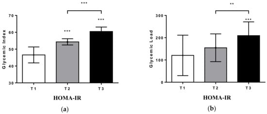 (a) Description of GI according to tertiles of HOMA-IR. (b) Description of GL according to tertiles of HOMA-IR. Significance is considered ** p < 0.01, *** p < 0.001.