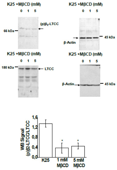 Treatment with MβCD largely alters the phosphorylation levels of LTCCs in CGNs (Figure 1). Compared to the control conditions (K25), treatment with 1 and 5 mM MβCD decreases the phosphorylation level of the β2 subunit of LTCCs by 60–70%.
