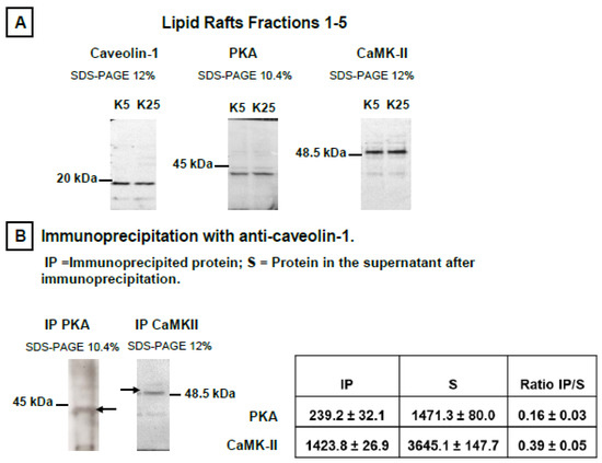 Lipid rafts were prepared as indicated in the Materials and Methods section from mature CGNs in MLocke’s K5 (proapoptotic conditions) and also in partially depolarizing plasma membrane media, K25 (survival conditions). Lipid raft fractions were characterized using H-Ras, caveolin-1, and flotillin as protein markers, as in previous works [8,9,10]. Western blots of lipid raft fractions show that PKA and CaMK-II are present in lipid rafts prepared from CGNs in MLocke’s K5 and K25 (Figure 2A). Note, however, that these protein kinases are not only present in the lipid raft fractions, since PKA and CaMK-II are also present in other membrane fractions.