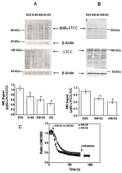 H-89 and KN-93 decrease the phosphorylation of the β2 subunit of LTCCs to values measured in proapoptotic MLocke’s K5. (A) CGNs in MLocke’s K25 were incubated for 15 min at 37 °C in a 5% CO2 culture chamber with 20 µM H-89, 30 µM KN-93, or in the absence of these inhibitors (K25 control), or after CGN incubation for 1 h at 37 °C in the 5% CO2 culture chamber in the proapoptosis MLocke’s K5 condition (K5). (B) CGNs in MLocke’s K25 were incubated for 15 min at 37 °C in the 5% CO2 culture chamber with 30 µM KN-92, 30 µM KN-93, or in the absence of these inhibitors (K25 control). After SDS-PAGE (7.5% acrylamide), the proteins were transferred to PVDF membranes for Western blotting as indicated in Materials and Methods. For panel B, the PVDF membrane was stripped twice to remove primary antibodies—anti-β2 subunit of LTCCs and anti-LTCC α1C subunit—and used afterward for β-actin detection. The results shown in these panels are representative of the results obtained in triplicate experiments with different CGN preparations. The position of the molecular weight marker bands closest to the target proteins of the primary antibodies, i.e., β2 subunit of LTCC, LTCC α1C subunit, and β-actin, are shown at the left or right side of the corresponding PVDF membrane images. Western blots were revealed by exposure to autoradiography films for (A) and with ChemiDocTM XRS+ from Bio-Rad for (B). The phosphorylation levels of the β2 subunit of LTCCs, (p)β2LTCC/LTCC, shown in the bar graphs of panels A and B, were measured as indicated in the legend for Figure 1 and are average results ± S.E. of triplicate experiments. (*) p < 0.05. (C) Time dependence of population averages of the 340/380 ratio in neuronal somas before and after the addition of 30 µM KN-93 (black-filled squares) or 30 µM KN-92 (white-filled squares) at the point indicated by the first arrow. At the point indicated by the second arrow, 10 µM nifedipine was added. Mature CGNs in culture were loaded with Fura-2, as indicated in the Materials and Methods section, and then changed to MLocke’s K25 buffer (37 °C) to start serial 340 and 380 image acquisition. Data acquisition was done as indicated in the Materials and Methods section, with exposure times lower than 0.4 s at time intervals of 30 s. The 340/380 ratio of neuronal somas was measured using the region of interest (ROI) tool of the HCImage software. The 340/380 ratio values shown are the average ± S.E. of experiments done with three different preparations of CGNs (n > 300 neuronal somas of fields taken from six plates for each experimental condition).