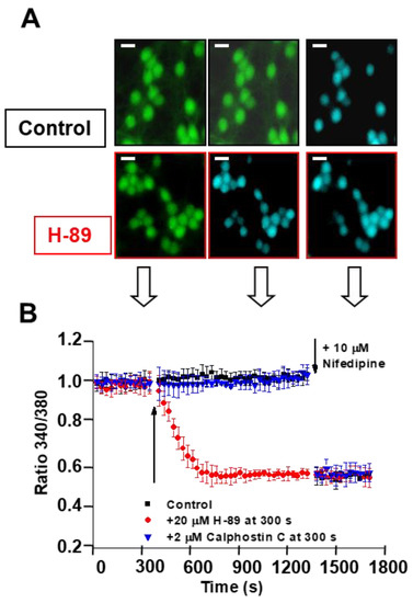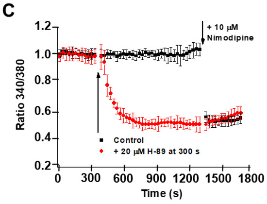 H-89 decreases CGN steady-state [Ca2+]i to values obtained upon the blockade of LTCCs by nifedipine and nimodipine, while calphostin C has no effect. Mature CGNs in culture were loaded with Fura-2, as indicated in the Materials and Methods section, and then changed to MLocke’s K25 buffer (37 °C) and treated with the indicated protein kinase inhibitors. (A) Representative pseudocolor images of the same fields of selected CGN plates before (left-most column of images) and after 15 min incubation (middle column of images) with 20 µM of the PKA inhibitor (H-89) or in the absence of inhibitor (control) and 2 min after the addition of 10 µM nifedipine post-H-89 (images in the right-most column). Pseudocolor scale for 340/380 ratio values: light blue, 0.5–0.6; green, 1.0–1.1. Scale bar = 10 µm. The white-filled arrows pointing toward Panel B indicate the approximate times at which these images were captured. (B,C) Time dependence of population averages of the 340/380 ratio in neuronal somas before and after the addition of the indicated protein kinase inhibitors after 350 s (at the point indicated by the first arrow). The kinetic analysis of the 340/380 ratio of the somas of CGNs was done for controls (vehicle DMSO addition, solid black squares) and for the addition of 20 µM H-89 (red solid circles) and 2 µM calphostin C (blue down-triangles), inhibitors of PKA and PKC, respectively. Each inhibitor was added to a different culture plate. At approximately 1350 s (at the point indicated by the second arrow), 10 µM nifedipine (B) or 10 µM nimodipine (C) was added to the culture plates in all conditions. Data acquisition and analysis were done after the selection of neuronal somas using the region of interest (ROI) tool of the HCImage software, as indicated in the Materials and Methods section, with exposure times lower than 0.4 s at time intervals of 30 s. The 340/380 ratio values shown are the average ± S.E. of experiments done with three different preparations of CGNs (n > 300 neuronal somas of fields taken from six plates for each experimental condition).