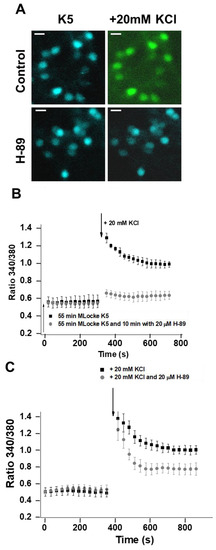 In MLocke’s with 5 mM KCl, fluorescence imaging of CGNs loaded with Fura-2 yields a low steady 340/380 ratio in the neuronal somas of 0.50 ± 0.05, i.e., [Ca2+]i ~40–50 nM (Figure 6A,B). The same 340/380 ratio readings were obtained in this medium in the presence or absence of H-89 (PKA inhibitor) added to the plate 10 min before starting the measurements of cytosolic calcium concentration (Figure 6A,B). However, H-89 largely impairs the kinetics of the [Ca2+]i response to the addition of 20 mM KCl to the extracellular medium, which increases the extracellular KCl up to 25 mM. In the controls for CGNs loaded with Fura-2, the addition of 20 mM KCl elicits biphasic kinetics with a strong and fast rise in the 340/380 ratio until reaching values higher than 1.0—between 1.2 and 1.5 for most neuronal somas in the plates—followed by slower kinetics for the decay in the 340/380 ratio (t½ ≤ 2 min) until reaching values of approximately 0.95 ± 0.05 (Figure 6A,B), i.e., [Ca2+]i~150 ± 30 nM, which is within the range obtained for the somas of CGNs loaded with Fura-2 several minutes after changing the cells to MLocke’s K25 [34]. The pre-incubation of CGNs with H-89 for only 15 min largely attenuates the rise in the 340/380 ratio after the addition of 20 mM KCl to the extracellular medium (Figure 6A,B). Noteworthy is that the steady-state 340/380 ratio attained after several minutes reaches a value of 0.60 ± 0.05, which is very close to the (340/380) ratio measured for the somas of control CGN plates before the addition of 20 mM KCl to the extracellular MLocke’s medium. The blockade of the [Ca2+]i response by the inhibitor of PKA requires several minutes of CGN pre-incubation, since only a slight attenuation of the strong and fast rise in the 340/380 ratio is observed when the PKA inhibitor is added simultaneously with 20 mM KCl to the extracellular MLocke’s medium (Figure 6C). This correlates with the change in the phosphorylation level of LTCCs elicited by the PKA inhibitor H89 after only a 15 min pre-incubation (Figure 3). It is to be noted that a 15 min pre-incubation of Fura-2-loaded CGNs with 2 µM of the PKC inhibitor calphostin C before the addition of 20 mM KCl has, at most, a weak effect that is statistically nonsignificant on the kinetics of the [Ca2+]i response to the addition of 20 mM KCl to the extracellular medium.