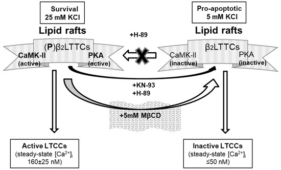 Schematic diagram summarizing the major results and conclusions of this work. The rise in the steady-state [Ca2+]i in neuronal somas up to the values needed for CGN survival induced by the increase in extracellular K+ from 5 to 25 mM is mediated by CaMK-II and PKA phosphorylation of the β2 subunit of LTCCs clustered in caveolin-1-rich lipid rafts. The gray contour filled with thin vertical lines represents caveolin-1-rich lipid rafts containing LTCC, CaMK-II, and PKA. The inhibitors of CaMK-II (KN-93) and of PKA (H-89) and the lipid raft-disrupting compound MβCD decrease the levels of phosphorylated LTCC, (P)-β2LTCC, to the values measured in proapoptotic 5 mM KCl medium, resulting in the inactivation of LTCCs and a sustained proapoptotic low steady-state [Ca2+]i in neuronal somas. For the sake of simplicity, other proteins present in caveolin-1-rich lipid rafts of mature CGNs (see, e.g., [8,9,10,49,62]) are not included in this schematic diagram.