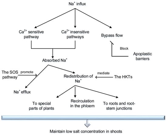 The net accumulation of Na+ in root cortical cells is due to the balance between the influx and efflux of Na+. A reduction in the Na+ accumulation in the root can be caused by either a decrease in influx or an increase in efflux [36]. Maintaining an ion homeostasis of high K+ and low Na+ in the cytoplasm is essential for the survival of both halophytes and glycophytes under salt stress. The SOS pathway plays essential roles in the Na+ efflux (Figure 2B). Three proteins known as SOS3, SOS2, and SOS1 are involved in the SOS signaling pathway. The SOS3 is a Ca2+ binding protein and can be activated by extracellular Ca2+. The SOS2 is a protein kinase and can be activated by the SOS3. Then the SOS3 and SOS2 form a complex. The SOS1 is a Na+/H+ antiporter located on the plasma membrane and can be activated by the complex composed of SOS3 and SOS2. Afterward, it is responsible for efflux of Na+ from the cytoplasm under salt stress [60]. Molecular and genetic characterization of several sos mutants have shown that the SOS pathway is activated by salt stress and is responsible for reconstruction of Na+/K+ homeostasis under salt stress [61].