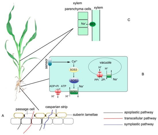Under salt stress, due to the increased SOS1 and PM H+-ATPase activity in roots, excess Na+ in the cytoplasm is either discharged into the extracellular domain of the external solution or discharged into the xylem and then transferred to the shoots.