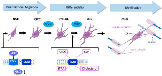 The role of Shh (Sonic Hedgehog) in neural stem cell (NSC) commitment to oligodendrocyte differentiation during remyelination. The process of oligodendrocyte maturation from NSCs to myelinating oligodendrocytes (mOL) requires Shh signaling reactivation. Smo activity seems to be crucial during the differentiation from premyelinating OLs (pre-OL) to immature oligodendrocytes (iOL). Smo agonists, such as Clobetasol (CLOB) or cholesterol, stimulate this passage while Smo inhibitors, such as cyclopamine (CYP) or itraconazole (ITRA), impair OL maturation via a poorly understood process.