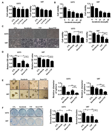 Tumor-treating field (TTField)-sensitizing effects of sorafenib on in vitro models of glioblastoma. (A) TTFields inhibited glioblastoma cell viability in an intensity-dependent manner. Cell viability was evaluated by cell counting using 0.4% Trypan Blue stain for U373 and U87 cells treated with TTFields for the indicated durations; * p < 0.05; (B) sorafenib inhibited glioblastoma cell Fluorine-18viability in a dose-dependent manner. Cell viability was evaluated by cell counting using 0.4% Trypan Blue stain for U373 and U87 cells treated with the indicated doses of sorafenib; * p < 0.05. (C–E) the viability of cells treated with a combination of TTFields and sorafenib was significantly lower than that of cells treated with either sorafenib or TTFields. The proliferation rate was detected by counting (C), MTT assay (D), and 3D colony culture (E). * p < 0.05; ** p < 0.01; (F) the sensitivity of U373 and U87 cells treated with sorafenib and TTFields was measured via a colony formation assay. The survival fraction, which was expressed as a function of the irradiation dose, was calculated as follows: survival fraction = colonies counted/(cells seeded × plating efficiency/100). * p < 0.05; ** p < 0.01. CTL: Control group; TTF: Tumor treating fields group.