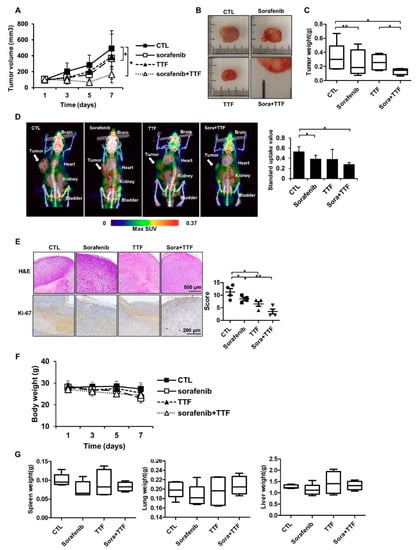 To assess the effect of TTFields combined with sorafenib on glioblastoma growth in vivo, we used a subcutaneous glioblastoma model generated by injecting human U373 cells into mice. As shown in Figure 2A, xenografts treated with a combination of TTFields and sorafenib displayed decelerated growth compared to the control group and the groups receiving either of the treatments. Thus, tumors in the mono-treated groups were significantly larger than those in the group receiving combinatorial treatment (Figure 2B). Concurrently, tumor weight was reduced in the mice receiving combinatorial treatment compared to that in mice receiving either of the treatments (Figure 2C). As shown in Figure 2D, low uptake of [Fluorine-18(18F)]-fluorodeoxyglucose (FDG) was observed in tumors treated with TTFields plus sorafenib as compared to tumors receiving either of the treatments. The maximum standard uptake value was 0.53 ± 0.09 in the control group, 0.39 ± 0.07 in the sorafenib-treated group, 0.38 ± 0.19 in the TTFields-treated group, and 0.28 ± 0.03 in the combination-treated group (Figure 2D). Xenografts of mice receiving either of the treatments showed more intense Ki67 staining than those of mice receiving combinatorial treatment (Figure 2E). There were no visible signs of toxicity from TTFields or sorafenib administration in the mice, as evident from the absence of differences in body weight and the weights of various organs, including the spleen, lungs, and liver (Figure 2F,G). Together, these data suggested that TTFields combined with sorafenib inhibits the growth of glioblastoma in vivo.