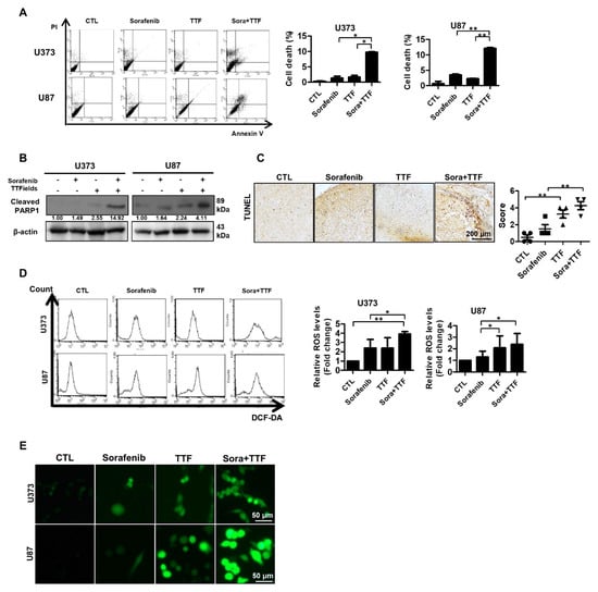 To investigate whether sorafenib and TTFields induce apoptosis, we assessed early apoptosis via annexin V and propidium iodide staining. In the two glioblastoma cancer cell lines, 48-h exposure to sorafenib plus TTFields significantly increased the proportion of early apoptotic cells (Figure 3A). Thereafter, we investigated whether sorafenib-enhanced TTFields cytotoxicity resulted from increased PARP cleavage, leading to enhanced apoptotic cell death. We observed increased PARP cleavage in response to combined TTFields and sorafenib treatment when compared to treatment with sorafenib alone (Figure 3B). To determine whether combinatorial therapy induces apoptosis in vivo, we evaluated the apoptotic rate using a terminal deoxynucleotidyl transferase-mediated dUTP nick-end labeling (TUNEL) assay. Apoptotic cell death was increased upon combinatorial treatment (Figure 3C). We also investigated the association between ROS production and enhancement of TTFields-induced apoptosis by sorafenib. ROS production was more strongly induced upon combinatorial treatment than upon individual treatments (Figure 3D), which may explain the increased the apoptotic rate upon combinatorial treatment. These data are consistent with the results of fluorescence microscopy, as shown in Figure 3E.