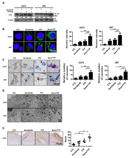To investigate the anticancer effects of sorafenib and TTFields further, we examined other cellular responses associated with cell death upon sorafenib or TTFields treatment; in particular, we investigated the effects on autophagy, since both TTFields and sorafenib induce autophagy [20,30]. Western blotting revealed that the levels of LC3, a specific marker of autophagosome generation, were increased in cells administered combinatorial treatment (Figure 4A). As shown in Figure 4B, increased accumulation of Cyto-ID Green, an autophagy indicator, was observed around combination-treated U373 and U87 cells. After 48 h of treatment with TTFields plus sorafenib, Giemsa-stained U373 and U87 cells exhibited ultrastructural changes in the whole cytoplasm and membranes, including loss of plasma membrane integrity and distinct vacuole formation, compared to those receiving individual treatments (Figure 4C). This drastic vacuolization of the cytoplasm without apparent loss of nuclear material is consistent with the described macrostructure of autophagosomes. In addition, transmission electron microscopy was used to verify autophagosome formation in cells receiving combinatorial treatment. As shown in Figure 4D, cells administered combinatorial treatment exhibited accumulation of large autophagic vacuoles with a typical double-layer membrane and organelle remnants, whereas only a few vacuoles were observed in cells receiving individual treatments. In addition, mouse xenografts were stained for LC3 to clarify whether sorafenib combined with TTFields could additionally induce autophagy in vivo compared to the individual treatments (Figure 4E). Collectively, our data showed that autophagy contributes to glioblastoma cell death after combinatorial treatment in vitro and in vivo.