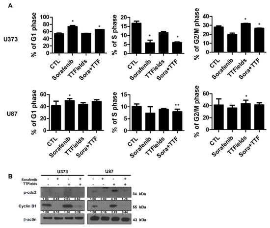 Sorafenib plus tumor-treating fields (TTFields) inhibits cell cycle progression in glioblastoma cells. (A) U373 and U87 cells were treated with sorafenib (5 µmol/L) and/or 0.9 V/cm TTFields for 24 h. Cell cycle distribution was analyzed quantitatively by flow cytometry. * p < 0.05; ** p < 0.01; (B) phospho-cdc2 and cyclin B1 expression was analyzed by Western blotting. β-Actin served as a loading control. Equal amounts of cell lysate (30 µg) were electrophoresed and analyzed; Band intensities were quantified and normalized to actin intensities (n = 3, mean ± SD).