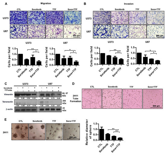 To determine whether sorafenib regulates the effects of TTFields on metastasis, we examined the effects of sorafenib and TTFields on U373 and U87 cell migration. A Transwell chamber assay revealed that combinatorial treatment decreased cell migration in the U373 and U87 cell lines after 24 h (Figure 6A). Furthermore, using a Matrigel invasion assay, we investigated whether sorafenib and TTFields could affect the invasiveness of glioblastoma cells. Serum-starved cells were seeded in the upper chambers of the Transwell assay system, and the cells that penetrated the Matrigel barrier in response to a chemoattractant (serum) were counted at various time points. Combinatorial treatment significantly decreased the number of invading U373 and U87 cells as compared to the individual treatments (Figure 6B). Together, these results suggested that sorafenib plus TTFields might effectively inhibit the migration and invasiveness of human glioblastoma cells. To investigate the molecular mechanism underlying the modulation of the expression of epithelial-to-mesenchymal transition markers by combinatorial treatment, Western blotting was used. Vimentin and fibronectin, mesenchymal markers, were downregulated in both cell lines (Figure 6C). Furthermore, we examined whether combinatorial treatment would block angiogenesis. Combinatorial treatment completely inhibited tube formation in 2H11 cells compared with the individual treatments (Figure 6D). In addition, colonies formed in control 3D 2H11 cell cultures were larger than colonies formed by cells treated with TTFields or sorafenib alone, whereas colonies formed by cells treated with the combination were the smallest (Figure 6E).