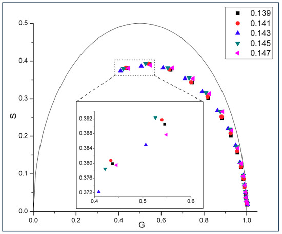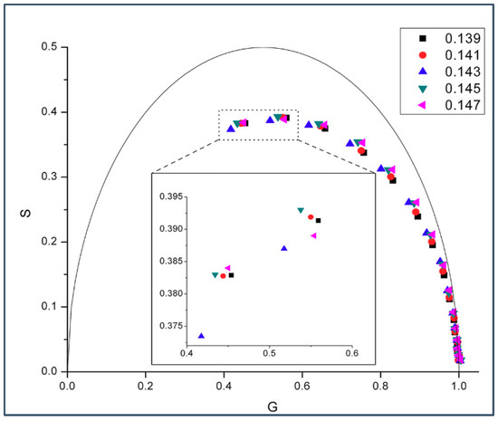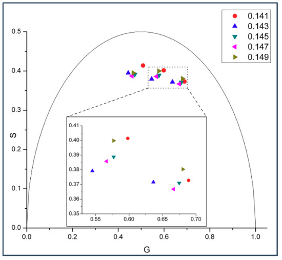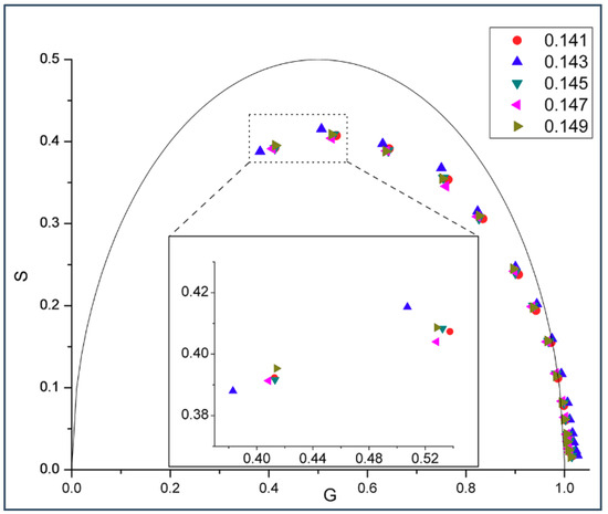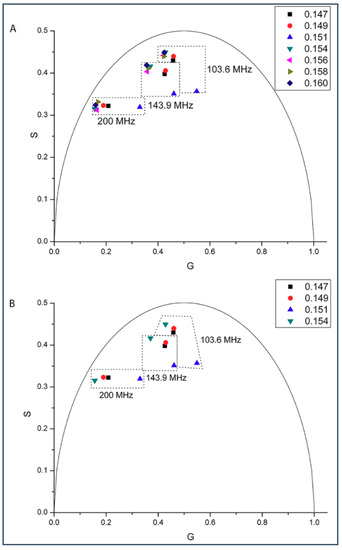 Figure 1 shows the phasor dots of intrinsic gD fluorescence obtained from gD/DMPC MLVs at 37 °C. At this temperature, DMPC would be in liquid-crystalline state. It can be seen from Figure 1 that, at a given modulation frequency, especially those at the high end (e.g., 200 and 143.9 MHz, inlet of Figure 1), the phasor point for 0.143 mole fraction of gramicidin D (blue upward triangles) stands out while the phasor points for the other gramicidin mole fractions (i.e., 0.139, 0.141, 0.145, and 0.147) are clumped to a different area, thus forming a biphasic change in phasor dot at 0.143 mole fraction of gD. Movement of the phasor point by ~0.01 on the G or S axis (see Materials and Methods) is a statistically significant change, according to [21]. The relative errors of S and G (ΔS and ΔG) were calculated (see Materials and Methods) and their values (the ranges are given in the figure legend) are small (<0.0015). This set of data supports the idea that gD/DMPC mixtures are similar to cholesterol/DMPC mixtures in membrane lateral organization, both being able to exhibit a biphasic change in membrane behavior at a critical mole fraction, where regular distributions are dominating [19,20].