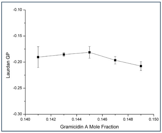 Laurdan’s generalized polarization (GP) versus gramicidin A mole fraction in gramicidin A/DMPC MLVs. Temperature = 37 °C. Error bars are the standard deviations of GP values obtained from three independently prepared samples.