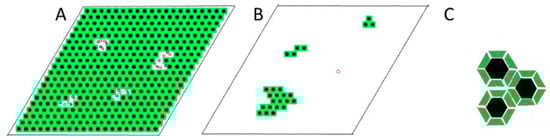 Lattice model of gramicidin/DMPC membrane. The bilayer is represented by hexagonally arranged units of squares. The surface area of a unit is equal with the surface area of a rigid cluster, (see Figure 7). A unit represents either a rigid cluster (green unit with black dot at the center) or part of the fluid phase (white unit with randomly distributed black and red circles). Black dot: gramicidin dimer. Green square: phospholipid molecules condensed to the central gramicidin dimer. Red and black circle: gramicidin monomer in the upper and lower layer of the bilayer, respectively. (A) ; (B) where M = 12; (C) Gramicidin dimers (black hexagons) may be regularly distributed into superlattices in the aggregated rigid clusters. This is an illustration of an aggregate of 3 rigid clusters where 12 phospholipids (green trapezoids) are condensed to each gramicidin dimer (6 located at the upper and 6 at the lower layer of the bilayer, i.e., this is the case when M = 12).