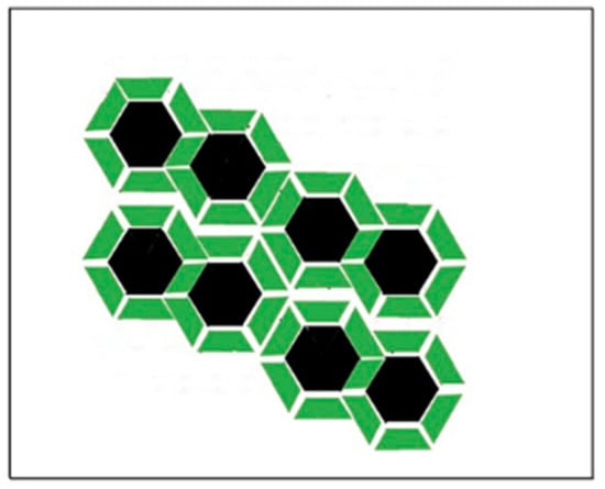 Aggregate of rigid clusters at where M = 11. Gramicidin dimers (black hexagons) may be regularly distributed into superlattices in the aggregated rigid clusters. This is an illustration of an aggregate of 8 rigid clusters where 11 phospholipids (green trapezoid: lipid condensed to one gramicidin dimer; green parallelogram: lipid condensed to two nearest neighbor gramicidin dimers) are condensed to each gramicidin dimer (5.5 located at the upper and 5.5 at the lower layer of the bilayer).