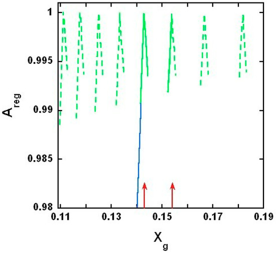 Proportion of regularly packed membrane area. Regular area fraction, is plotted against the gramicidin mole fraction, . Green lines: the curves of regular area fractions calculated around the critical gramicidin mole fractions, by Equation (4). Green dashed lines are theoretically calculated but not experimentally supported. At the theoretically predicted peaks would appear experimentally if more than 12 DMPC’s were able to condense to a gramicidin dimer. Green solid lines are theoretically calculated and experimentally supported. One of the red arrows is at the measured lower limit of critical mole fractions, (Figure 1, Figure 2, Figure 3 and Figure 4). The other red arrow is at the measured upper limit of the critical mole fractions, (Figure 5) which is also the solubility limit of gramicidin in DMPC bilayer. Gramicidin precipitates from the gramicidin/DMPC bilayer above this mole fraction (see explanation to Figure 5). The blue line is the assumed change of if there is no critical gramicidin mole fraction below 0.143. If the vertical axis started from and the horizontal axis from , then the blue line would go from (, ) to (, ). The model parameters are listed in Table S1 and the energy difference was: cal/mol.