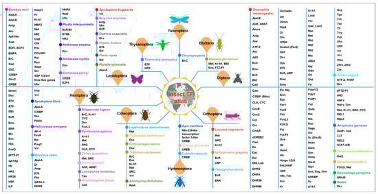 The insect transcription factor (TF) atlas, including the well-studied TFs and their related references collected in the review (See Table S1 for more detailed information about these TFs, and we apologize to researchers whose work could not be discussed and cited in the main text due to space limitations). As yet, diverse TFs have been documented in at least nine different insect orders including Diptera, Hemiptera, Lepidoptera, Coleoptera, Orthoptera, Thysanoptera, Blattaria, Neuroptera, and Hymenoptera. Different insect species are also denoted by colored circles on the vertical line.