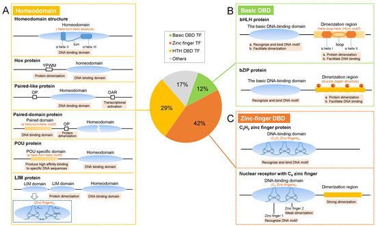 Most TFs contain a DNA-binding domain (DBD) that specifically recognizes and binds to TF-binding sites in the enhancer or promoter of the target gene to read out information and modulate target transcription [13]. Therefore, eukaryotic TFs are generally classified based on their DBD. In humans and mice, TFs are divided into 10 superclasses, the first three of which are the helix-turn-helix (HTH) domain TFs (mostly homeodomain TFs), the basic DBD TFs, and the zinc finger (ZF) TFs [5,14]. These three superclasses occupy 90% and 86% of almost all TFs in humans and mice, respectively [14]. In insects, these three superclass TFs also account for the majority, and we summarize the structures of the three superclasses in insects as follows.
