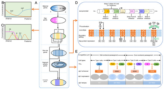 Establishment of the embryonic anterior–posterior (A-P) axis in Drosophila. The diagram is adapted from Gilbert’s works [40,41]. (A) Regulatory hierarchy of the formation of Drosophila A-P axis patterning. The maternal effect proteins Bicoid (Bcd) and Caudal (Cad) form a concentration gradient along the A-P axis and generate specific positional information to activate the expression of the gap gene hunchback (Hb). Hh further initiates the proper expression of other gap genes along the A-P axis. Gap proteins subsequently activate the expression of pair-rule genes, which form seven stripes perpendicular to the A-P axis and divide those discontinuous regions defined by the gap gene into body segments. The pair-rule proteins then regulate the expression of segment polarity genes in specific cells of each somite, and their 14 expression stripes establish the boundaries of parasegments. Finally, each segment is characterized by specifically expressed Hox genes. (B) The concentration gradient of the maternal effect proteins Bcd and Cad along the A-P axis in the early cleavage embryo. (C) The concentration changes in gap genes along the A-P axis. (D) Regulation of expression of the pair-rule gene even-skipped (eve) in seven stripes. The above region represents a partial promoter of the eve gene that contains five different enhancers responsible for the distinct stripes. The lower part illustrates how TFs regulate eve expression in different stripes. The black box represents the TF, the green characters indicate the enhancer of eve, and the orange circles display the cells expressing eve. The vertical bars with the letters “A” and “P” denote the anterior and posterior boundaries of the eve stripe, respectively, and the numbers show the number of eve bands. (E) Regulation of a repetitive unit of sloppy paired 1 (slp1) stripe [42]. The 14-stripe patterning constitutes seven repetitive units, each containing odd-numbered and even-numbered parasegments. The odd-numbered parasegment consists of two types of cells: two type I cells in the posterior half do not express slp1 and two type II cells in the posterior half that express slp1. The even-numbered parasegment also contains two types of cells: type III cells that do not express slp1 in the first half and the latter type IV cells expressing slp1. The expression of slp1 in different cell types is regulated by different pair-rule proteins in a specific combination to regulate the proximal early stripe element (PESE) or the distal early stripe element (DESE) of slp1. The colored hexagons indicate the pair-rule proteins, the orange quadrants represent the enhancer, the gray ovals exhibit the cells that do not express slp1, the blue ovals denote the cells expressing slp1, the gray rectangles with “No” show no slp1 strips, and the blue rectangles represent slp1 strips. TF abbreviations: Hb: Hunchback; Gt: Giant; Kr: Krüppel; Kni: Knirps; Tll: Tailess; Zld: Zelda; Opa: Odd-paired; Ftz: Fushi tarazu; X: represents an as yet unidentified Factor X.