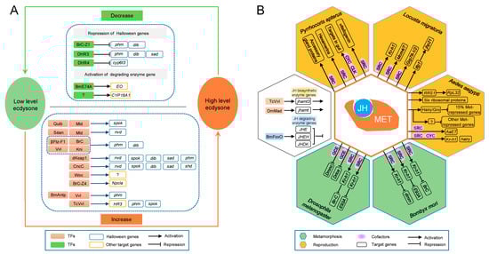 The 20-hydroxyecdysone (20E) and juvenile hormone (JH) signaling pathways regulating insect molting, metamorphosis, and reproduction. (A) Regulation of ecdysone titer by TFs. Changes in the ecdysone titers of insects are synergistically controlled by the synthesis and degradation of ecdysone. A low level of ecdysone promotes TFs to specifically regulate the Halloween genes in PG, thereby increasing steroidogenesis. A high level of ecdysone drives TFs to repress the expression of Halloween genes and activate the expression of degradative enzyme genes to directly degrade ecdysone, thus decreasing ecdysteroid titers. (B) Regulation of insect reproduction and metamorphosis by JH signaling pathway-related TFs. The white hexagon on the left shows TFs regulating the synthesis and degradation of JHs; the central hexagon represents JH binding to the JH receptor Met to regulate the transcription of downstream target genes; the orange hexagons display the JH/Methoprene-tolerant (Met) complex regulates downstream targets to control insect reproduction; the green hexagons indicate metamorphosis; and the purple gradient ellipses denote the cofactors of Met.
