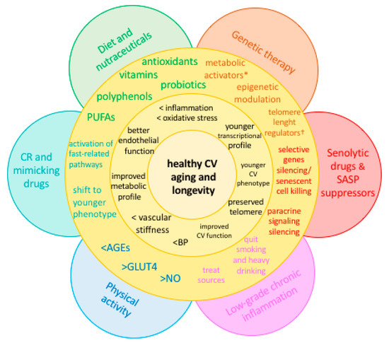Figure 3. Current and future strategies to preserve the flower of youth. * Sirtuins and mitochondria activators; † telomerase activators. AGEs: advanced glycation end products; BP: blood pressure; CR: caloric restriction; CV: cardiovascular; GLUT4: glucose transporter type 4; NO: nitric oxide; PUFAs: polyunsaturated fatty acids; SASP: senescence-associated secretory phenotype.