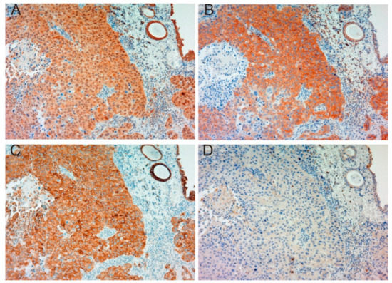 Table 1 shows patient characteristics. Immunohistochemical appearance is shown in Figure 1, Figure 2, Figure 3 and Figure 4. Positive staining of all molecules, which was defined as membranous staining with or without cytoplasmic stain, was observed in cancer cells. As shown in Table 2, MET, phosphorylated MET (phospho-MET), matriptase and HAI-1 were highly expressed in 12 cases (46%), 7 cases (27%), 18 cases (69%) and 11 cases (42%), respectively. Although increased expression of total MET was observed in patients 10–18, phosphorylation was downregulated. High expression of HAI-1 was also observed in these patients, suggesting HAI-1-induced regulation of MET phosphorylation (Figure 1). In contrast, upregulated MET phosphorylation was observed in patients 24–26, whereas HAI-1 was downregulated (Figure 2). Considering these results, HAI-1 may have an important role in the regulation of ligand-dependent MET activation in bladder cancer. On the other hand, both expression of HAI-1 and phosphorylation of MET were upregulated in patients 20–23. Histopathological findings of these cases are shown in Figure 3. Of interest, phosphorylation of MET and expression of HAI-1 were observed reciprocally in cancer tissues. These findings also suggest the significant role of ligand-dependent activation of MET and HAI-1-induced regulation in bladder cancer. In peri-cancerous normal urothelium, total MET and matriptase expressed in the majority of urothelial cells, whereas expression of HAI-1 was observed in umbrella cells and phosphorylation of MET was enhanced in the basal area of the urothelium (Figure 4)