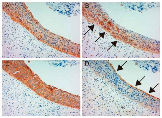 Immunohistochemical appearance of total MET (A), phospho-MET (B), matriptase (C) and HAI-1 (D) in serial tissue sections of high-grade urothelial carcinoma (patient 23, ×200 magnification). Dominant expression of total MET (A) and matriptase (C) is observed. Phosphorylation of MET is also upregulated (B); however, downregulation is observed in part (arrows). In contrast, increased expression of HAI-1 is observed in the area with downregulated phospho-MET (D, allows). This case shows a representative pattern of reciprocal expression of HAI-1 and phospho-MET.