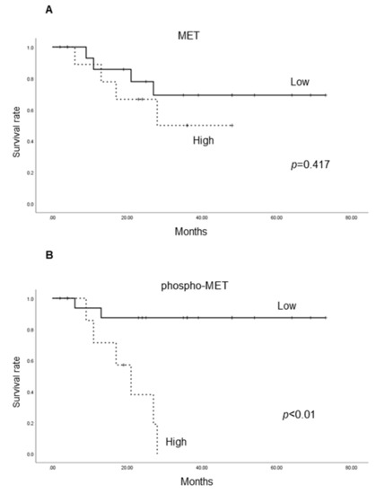 - Miyata, Y.; Sagara, Y.; Kanda, S.; Hayashi, T.; Kanetake, H. Phosphorylated hepatocyte growth factor receptor/c-Met is associated with tumor growth and prognosis in patients with bladder cancer: Correlation with matrix metalloproteinase-2 and -7 and E-cadherin. Hum. Pathol. 2009, 40, 496–504. [Google Scholar] [CrossRef] [PubMed]