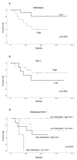 We analyzed cancer-specific survival according to the expression of each molecule (Figure 5). High expression of phospho-MET and matriptase was both significantly correlated with poor prognosis. Although high expression of MET tended to correlate with poor prognosis, statistical significance was not achieved. Then, in response to reports that an imbalance of matriptase and HAI-1 was associated with tumor aggressiveness [22], we evaluated cancer-specific survival in subgroup (Figure 5E). The low matriptase/ high HAI-1 expression group showed favorable prognosis, whereas the high matriptase/ low HAI-1 expression group showed a significantly poorer prognosis.