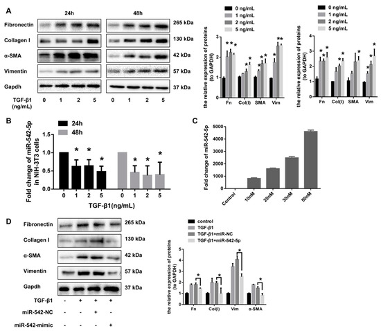 miR-542-5p blocked the activity of NIH-3T3 cells in vitro. (A) The protein expression levels of fibronectin, vimentin and α-SMA were obviously elevated in NIH-3T3 cells when treated with an increased dose of TGF-β1 (0, 1, 2, 5 ng/mL) for 24 h or 48 h. The results of Western blot were analyzed by ImageJ software, * p < 0.05 versus the control group. (B) The miR-542-5p expression levels were significantly decreased in NIH-3T3 cells treated with different doses of TGF-β1 (0, 1, 2, 5 ng/mL) for 24 h or 48 h, * p < 0.05 versus the control group. (C) miR-542-5p mimics transfection efficiency. Different concentrations (10 nM, 20 nM, 30 nM, 50 nM) of miR-542-5p mimic showed different transfection efficiencies and 30 nM was chosen in this study to optimize the experiment. (D) Western blot analysis was performed to detect the fibrosis markers (fibronectin, collagen I, α-SMA and vimentin) in NIH-3T3 cells pretreated with miR-542-5p mimics (30 nM) for 24 h, followed by TGF-β1 (5 ng/mL) for 48 h. * p < 0.05 versus the TGF-β1 + mimic-NC group.