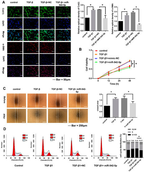 miR-542-5p inhibited the pro-fibrotic effect of TGF-β1 on NIH-3T3 cells. (A) The fluorescence intensity of collagen I and α-SMA in NIH-3T3 cells co-treated with 5 ng/mL TGF-β1 and 30 nM miR-542-5p mimic was notably lower than the cells treated with 5 ng/mL TGF-β1; * p < 0.05 was considered to be statistically significant. (B) The proliferation ability of the NIH-3T3 cells co-treated with 5 ng/mL TGF-β1 and the 30 nM miR-542-5p mimic was significantly reduced compared with the cells treated with 5 ng/mL TGF-β1 48 h after treatment. # TGF-β1+mimic NC group vs. Control group, * TGF-β1+mimic NC group vs. TGF-β1+miR-542-5p group. p < 0.05 for # and *. (C) The migration ability of NIH-3T3 cells co-treated with 5 ng/mL TGF-β1 and 30 nM miR-542-5p mimic was notably lower than that of the cells treated with 5 ng/mL TGF-β1,* p < 0.05 was considered statistically significant. (D) Flow cytometric analysis showed that the numbers of TGF-β1 treated cells in S phase was increased remarkably compared to the control group, while the transfection of miR-542-5p mimic restored this increase on the cell cycle, * p < 0.05 was considered statistically significant.