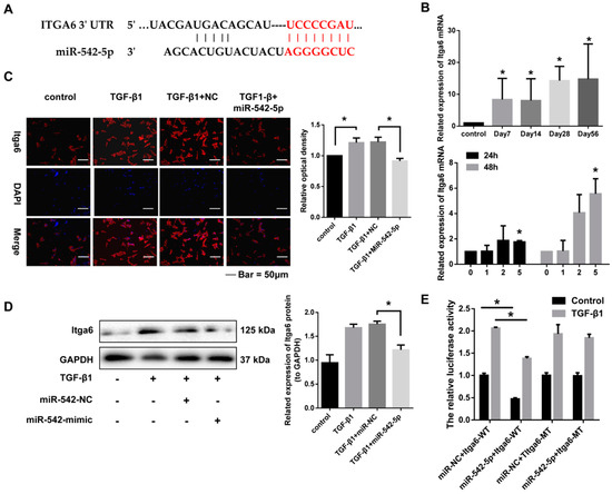 Integrin α6 (Itga6) was a direct target of miR-542-5p. (A) Schematic outlining the predicted binding sites for miR-542-5p in the 3’-UTR of Itga6 mRNA. Red part represented the base-pairing of the seed sequence of miR-542-5p and the 3’UTR of Itga6. (B) The expression level of Itga6 mRNA was significantly increased in the lung tissues of mice treated with SiO2 on the seventh day, the 14th day, the 28th day and the 56th day and cells treated with different doses of TGF-β1 (0, 1, 2, 5 ng/mL) at 24 h and 48 h, * p < 0.05 versus the control group. (C) The fluorescence intensity of Itga6 in NIH-3T3 cells co-treated with 5 ng/mL TGF-β1 and 30 nM miR-542-5p mimic was notably lower than the cells treated with 5 ng/mL TGF-β1; The ImageJ software was used for fluorescence quantification, * p < 0.05 was considered to be statistically significant. (D) The protein level of Itga6 in NIH-3T3 cells co-treated with 5 ng/mL TGF-β1 and 30 nM miR-542-5p mimic was notably lower than the cells treated with 5 ng/mL TGF-β1, * p < 0.05 versus the TGF-β1 + mimic-NC group. (E) Effects of the miR-542-5p mimic on Itga6 3′-UTR luciferase reporters in NIH-3T3 cells. Luciferase activities were calculated as the ratio of firefly/Renilla activities and normalized to the miR-NC + Itga6 wild type (WT) group. * p < 0.05 was considered statistically significant.