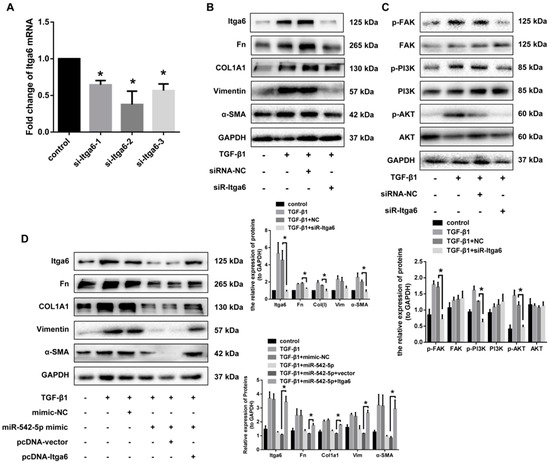 miR-542-5p suppressed fibroblast differentiation by targeting Itga6 through the FAK signaling pathway. (A) Knockdown efficiency of three siRNAs towards Itga6. (B) The protein level of Itga6 and other fibrosis markers in NIH-3T3 cells transfected with siR-Itga6. Except for the inhibition of Itga6 expression, siR-Itga6 restored the level of fibrosis markers (fibronectin, collagen I, α-SMA and vimentin), which were previously increased by TGF-β1. * p < 0.05 versus the TGF-β1 + siRNA-NC group. (C) Western blot analysis of protein levels of the phosphorylated or non-phosphorylated FAK/PI3K/AKT signaling pathway, * p < 0.05 was considered to be statistically significant. (D) Western blot analysis of fibrosis markers (fibronectin, collagen I, α-SMA and vimentin) in NIH-3T3 cells co-treated with miR-542-5p mimic and pcDNA-Itga6. * p < 0.05 versus TGF-β1 plus the miR-542-5p mimic and the pcDNA vector group.