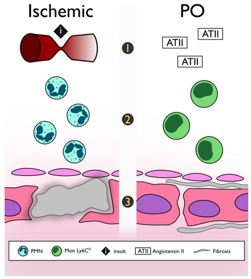 Key differences between the ischemic and PO-HF murine model. (1) Type of insult, (2) First to arrive: type of cellular infiltrate, and (3) type of fibrosis. Mon Ly6Chi: inflammatory monocytes; PMN: Polymorphonuclear neutrophils; PO: Pressure overload.