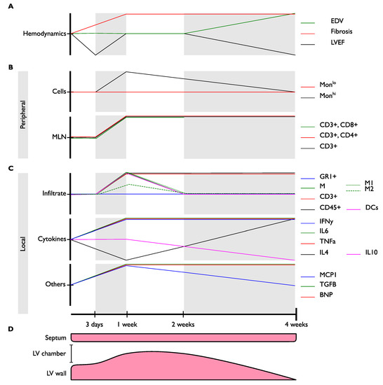 Graphical representation of changes through time in PO-HF. This figure is divided vertically in four panels (A to D) representing different groups of parameters evaluated; each panel has at its right end, the color code that represents each color line; and along the X-axis at the bottom, a timeline can be observed representing critical time frames for the PO-HF model. The graphical values plotted represent significant changes for increased or decreased values compared with their respective control group at the same moment of measurement. (A) Hemodynamic parameters. (B) Peripheral cell populations. (C) Heart tissue measurements. (D) Thickness of LV wall and dimensions of LV chamber. X-axis represents time. Y-axis is divided into a different set of measured parameters. Values represent significant changes for increased or decreased values compared with control groups. MLN: Mediastinal lymph nodes; EDV: End diastolic volume; LVEF: Left ventricle ejection fraction; Mon: Monocytes; M: Macrophages; M1: Pro-inflammatory macrophages; M2: Anti-inflammatory macrophages; DCs: Classical dendritic cells; BNP: Brain natriuretic peptide.