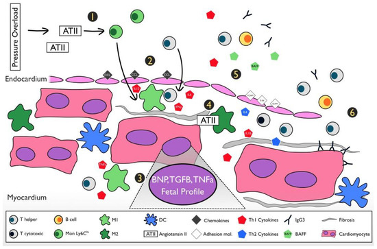 Summary of the PO-HF murine model. 1) Progressive PO stimulates the release of ATII. ATII stimulates mobilization of Ly6Chi monocytes from the bone marrow and spleen [30,38,40,41]. ATII and mechanical stress stimulate the expression of chemokines promoting infiltration of Ly6Chi Mon following its differentiation into M1 [37,56]. 2) Pro-inflammatory cytokines expressed in the heart (e.g., TNFα) as well as released from M1 and chemokines further stimulates mobilization and infiltration of CD4+ T cells [38,40,47,48]. M1 produce IL-12, which induces IFN-ɣ by T cells that activate macrophages that produce MCP1, creating a positive feedback of monocyte infiltration, M1 activation, and T cell infiltration and activation [54]. 3) Mechanical stress induces expression of structural genes that lead to a hypertrophic response. 4) ATII stimulates M2 production of TGFβ, leading to fibroblast stimulation and a reactive fibrotic response [37,39,57]. However, it is still not clear the process of transition from M1 to M2 [58]. Then, macrophage population starts to decline progressively, which correlates with a reduced number of circulating monocytes [47,48], marking the beginning of the transition from an innate to an adaptive response. 5) Expansion of T cells in the heart and expression of leukocyte adhesion molecules, VCAM1, E-Sel, and ICAM1 [47]. Increased IL-4 and BAFF suggests the participation of B cells, key modulators of the T cell response [49,50,51]. Structurally it starts a progressive increase of EDV [48,50]. 6) The second peak of DCs is observed and the predominance of the CD4+ T cell subset and deposition of IgG3 suggests that the sustained inflammatory response belongs to the adaptive immune response with both cellular and humoral participation [49,50].