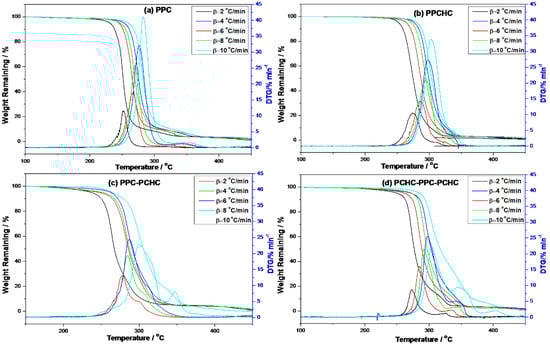 TG-DTG curves of the resultant polymers at different heating rates. (a) PPC; (b) PPCHC; (c) PPC-PCHC; (d) PCHC-PPC-PCHC.