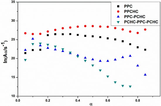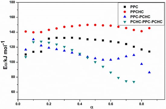 In addition, the decomposition of four polymers are completed at ~350 °C. The KAS method has been employed to evaluate the activation energies of different polymers during thermal decomposition because of its good adaptability and validity for model-free approaches. At a constant value of conversion rate α, the plots of ln (β/Tα2) versus 1/Tα. As shown in Figure S5, the plots of ln (β/Tα2) versus 1/T at several heating rates obtain well fitted straight lines whose slopes allow the evaluation of the apparent activation energy. The distribution of the activation energy (Eα) for different polymers is presented in Figure 2. It can be seen that the effective activation energy varies with conversion, which is an indication of a complex mechanism of the decomposition reaction. The process of PPC, PPC-PCHC, and PCHC-PPC-PCHC begins with Eα~110 kJ mol−1 and then slightly increases to 130 kJ mol−1. In addition, Eα for block polymers PPC-PCHC and PCHC-PPC-PCHC decrease sharply to ~90 kJ mol−1 and 75 kJ mol−1. For random polymer PPCHC, the Eα remains stable ~140–150 kJ mol−1. The average activation energies for PPC, PPCHC, PPC-PCHC, and PCHC-PPC-PCHC are 124.6 ± 6.8 kJ mol−1,145.5 ± 3.0 kJ mol−1, 109.9 ± 7.6 kJ mol−1, and 104.9 ± 16.2 kJ mol−1, respectively. The variation tendency tells us that the Eα of the block copolymer PPC-PCHC and PCHC-PPC-PCHC have a similar trend during the process of thermal decomposition while the variation tendency of PPC and PPCHC were relatively stable.