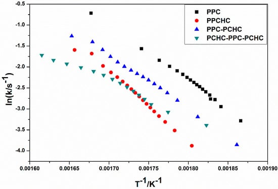Rate constant as a function of reciprocal temperature for the thermal decomposition of different polymers.