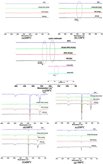 According to previous research [,,,], the thermal decomposition behavior of PPC obeys two kinds of mechanism including the main chain scission reaction and the unzipping reaction. The unzipping reaction involves the backbiting of the terminal hydroxyl groups at the carbon of carbonate linkage leading to the formation of cyclic carbonate. From the FTIR spectra of pyrolysates at different temperatures shown in Figure 5, it can be seen that the peak stands for carbon dioxide is observed at 230 °C while the peaks stand for cyclic carbonates are observed at 250 °C for PPC, PPC-PCHC, and PCHC-PPC-PCHC and higher than 270 °C for PPCHC, which indicates the main chain scission reaction and the unzipping reaction during the decomposition process first occuring in PC-PC segments. In addition, the onset unzipping reaction temperature of the random polymer PPCHC is higher than that of PPC and block polymers. Comparing the intensity of the IR absorption peaks of the pyrolysates at a different temperature, we can see that large scale evolution of cyclic carbonates happens at a relatively lower temperature (about 300 °C) for PPC and higher temperature (about 350–400 °C) for PPCHC. While for the block copolymers, large scale evolution of cyclic carbonates happens at a wider temperature range (300–400 °C). It is supposed that the random polymer PPCHC probably has a large content of PC-CHC or CHC-PC linkages in the terpolymer, which means the steric hindrance of bulky cyclohexane groups can suppress the backbiting process and retard the unzipping reaction. Thus, the thermal stability of PPCHC is much better than PPC. While, for the block copolymers, the PC-PC block and CHC-CHC block exhibit similar thermal stability as PPC and PCHC, respectively, so the temperature range of large scale evolution of cyclic carbonate was wide and two maximum decomposition temperatures were observed, as shown in Table 1. The above supposition was further confirmed by Py-GC/MS, which provide a way to measure the thermal decomposition reactions in each stage by analyzing mixture-evolved gases. Based on the results of TG analysis, the pyrolysis temperatures were set at 200 °C, 250 °C, 300 °C, 350 °C, and 400 °C to obtain the formation curves of pyrolysates to analyze the degradation mechanisms. The chromatograms of pyrolysis products at different temperatures and their identifications are shown in Figure 6 and Table 2.