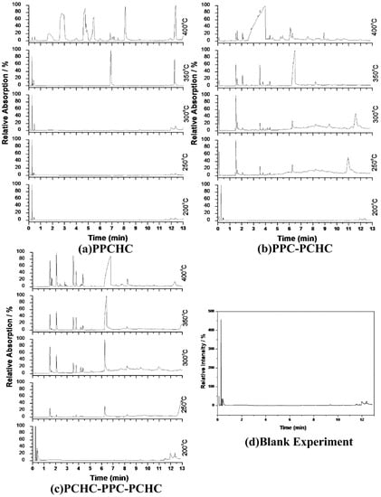 Chromatogram of pyrolysis products by Py-GC/MS at different temperatures :(a) PPCHC; (b)PPC-PCHC; (c)PCHC-PPC-PCHC; (d) Blank Experiment.