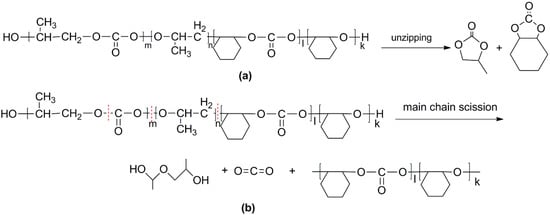 Possible decomposition pathway of the polymers. (a) Unzipping of the polymer backbone and (b) main chain scission.