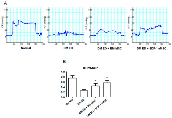 Comparison of erectile function among groups. (A) Representative images of intracavernous pressure (ICP) in response to electrical stimulation of the cavernosal nerve. (B) Ratio of ICP to mean MAP (mean arterial pressure) in each group. Each bar shows the mean value (standard deviation). * p < 0.05 compared with the DM ED (diabetes mellitus erectile dysfunction) group.
