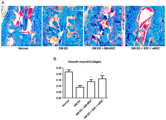 Representative images of Masson Trichrome staining in the corpus cavernosum. (A) Red indicates smooth muscle, and blue represents collagen. Scale bar: 100 μm. Original magnification: ×100; (B) Percentage area of smooth muscle for each group. Each bar shows the mean value (standard deviation). * p < 0.05 compared with the DM ED group.