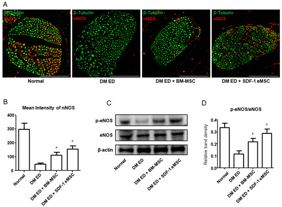 Figure 4A shows that the intensity of neuronal nitric oxide synthase (nNOS) varied among groups. nNOS was lower in the DM ED group than in the other groups (Figure 4B). In a quantitative analysis, intensities were higher in the SDF-1 eMSC group than in the normal (p < 0.05) and BM-MSC groups. Figure 4C summarizes p-eNOS and eNOS expression in each group. Figure 4D shows that in the SDF-1 eMSC group, p-eNOS levels were higher than those in the other groups.