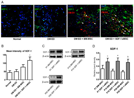 Representative images of SDF-1 expression in vivo and in vitro. (A) Representative images of SDF-1 expression in the corpus cavernosum. CM-DiI-labeled MSCs are stained in red and green represents SDF-1. Cell nuclei are stained blue with 4,6-diamidino-2-phenylindole. Arrow indicates SDF-1 released by MSCs. Scale bar: 100 μm. Original magnification: ×200; (B) Mean intensity of SDF-1 expression; (C) SDF-1 expression after each passage of BM-MSCs in vitro; (D) Relative density of bands in the western blot analysis for each group. Each bar shows the mean value (standard deviation). * p < 0.05 compared with passage 1 BM-MSCs, # p < 0.05 compared with passage 10 BM-MSCs, and & p < 0.05 compared with passage 20 BM-MSCs.