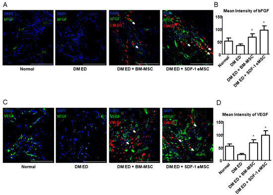 Representative images of bFGF and VEGF expression in the corpus cavernosum. (A) Representative images of bFGF staining for each group. Red indicates MSCs, green indicates bFGF, and blue shows cell nuclei. Arrow indicates bFGF released by MSCs. Scale bar: 100 μm. Original magnification: ×200; (B) Mean intensity of bFGF expression. (C) Representative images of VEGF staining for each group. Red indicates MSCs, green indicates VEGF, and blue indicates cell nuclei. Arrow indicates VEGF released by MSCs. Scale bar: 100 μm. Original magnification: ×200; (D) Mean intensity of VEGF expression. Each bar shows the mean value (standard deviation). * p < 0.05 compared with the DM ED group.