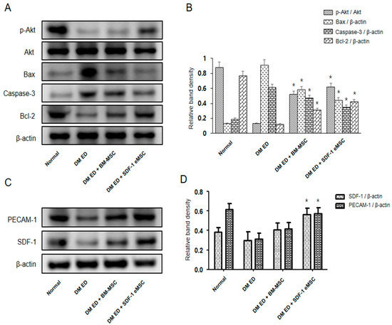 Protein expression in the corpus cavernosum. (A) All groups were compared with respect to p-AKT, AKT, Bax, Caspase-3, and Bcl-2 expression in the corpus cavernosum by western blotting. (B) Relative density of bands in the western blot analysis for each group. (C) All groups were compared with respect to PECAM-1 and SDF-1 levels in the corpus cavernosum by western blotting. (D) Relative density of bands in the western blot analysis for each group. Each bar shows the mean value (standard deviation). * p < 0.05 compared with the DM ED group.